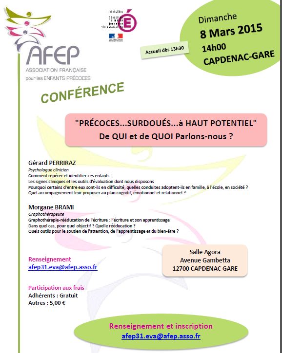 Dimanche 8 mars 2015 "Précoces… Surdoués…à haut potentiel… De QUI et de QUOI parle-t-on?" S'inscrire | | | | | | | | | | | | |