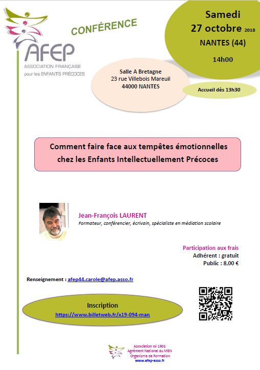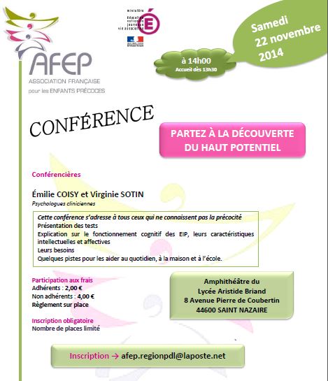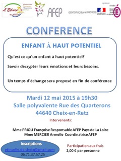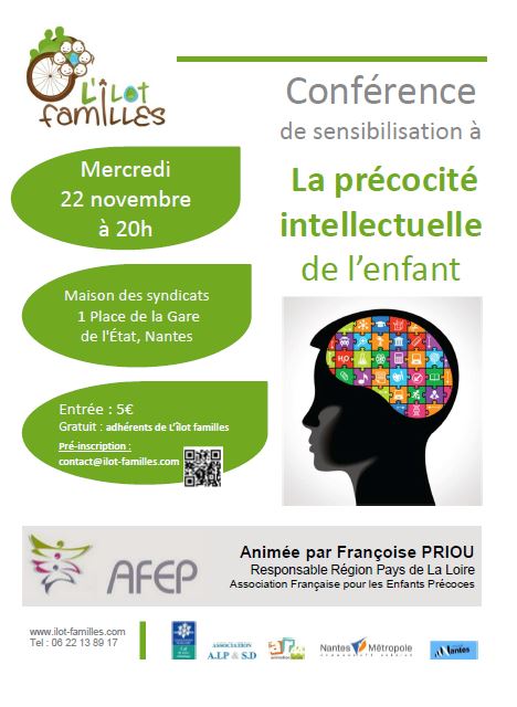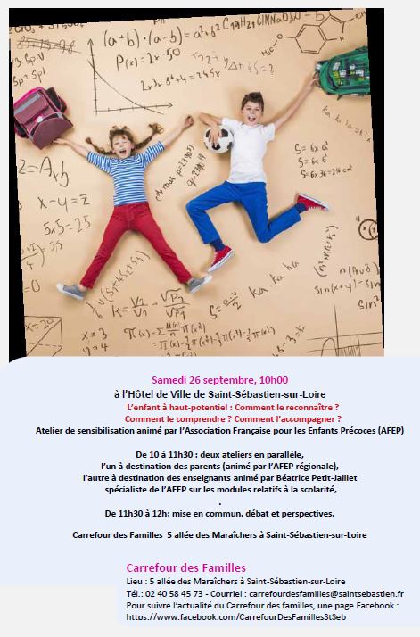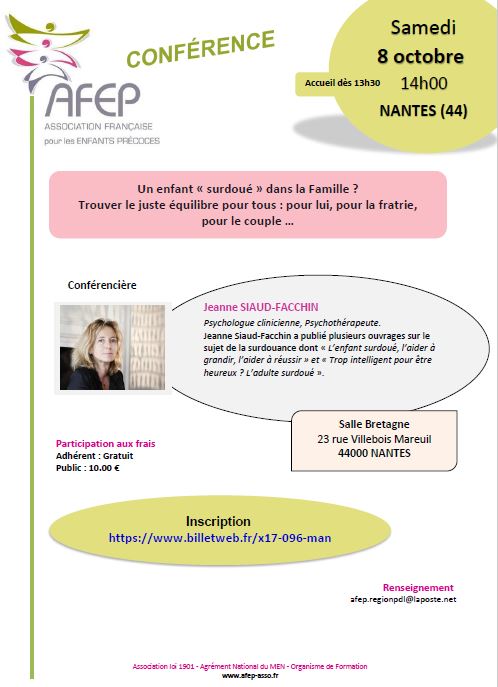 "Un enfant "surdoué" dans la famille? Trouver le juste équilibre pour tous : pour lui, pour la fratrie, pour le couple…" Renseignements et Inscriptions                           —> ATTENTION