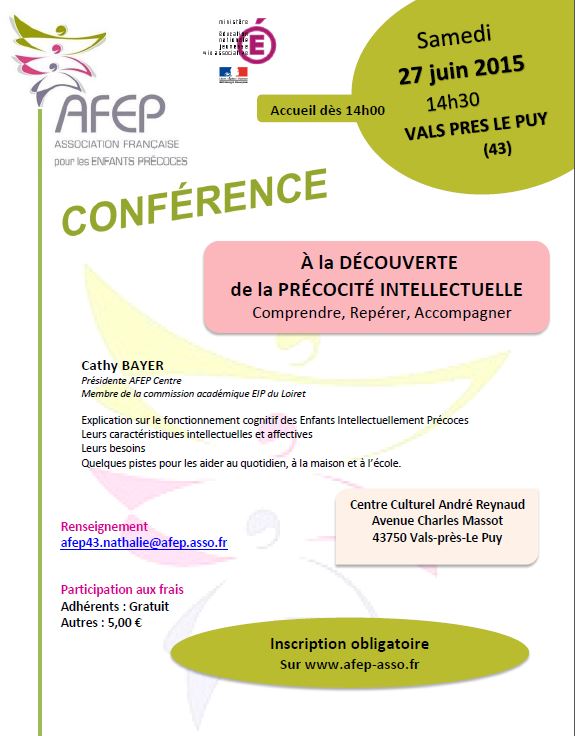 | Samedi 27 juin 2015 à VALS PRES LE PUY CONFERENCE "A la découverte de la précocité intellectuelle : Comprendre, cialis repérer, accompagner" S'inscrire |