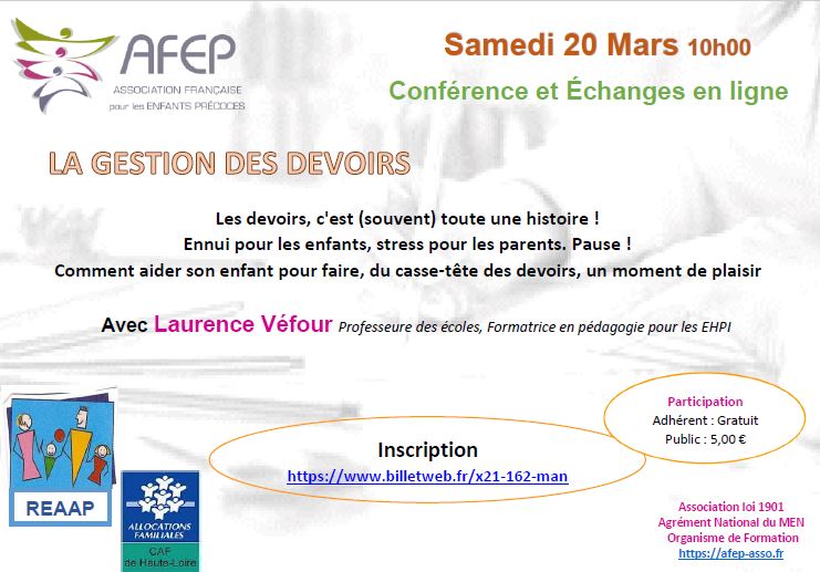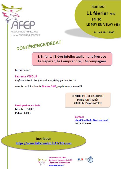 CONFERENCE "L'Enfant, l'Elève intellectuellement précoce, le repérer, le comprendre, l'accompagner?" Renseignements et Inscriptions |
