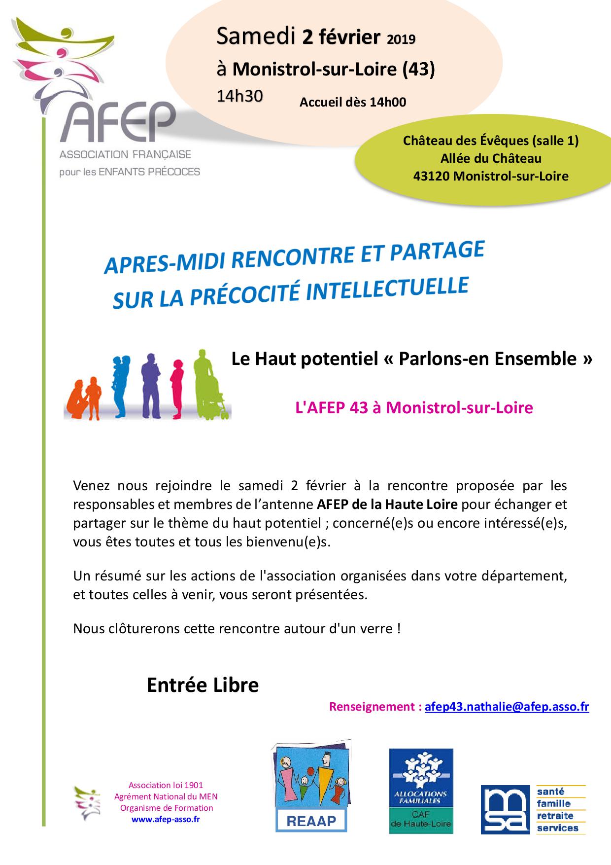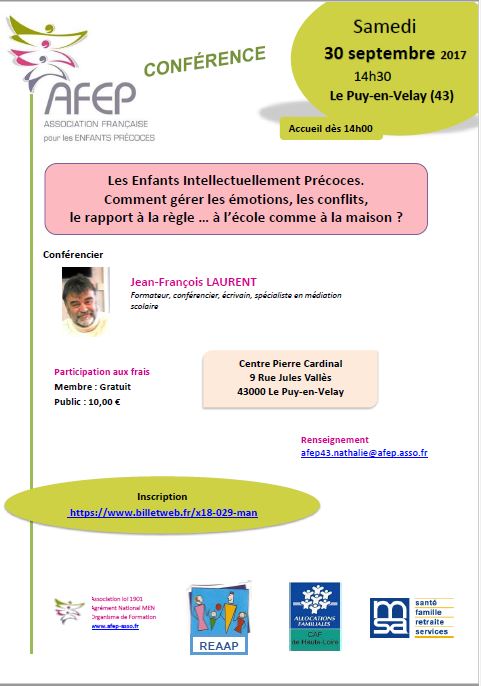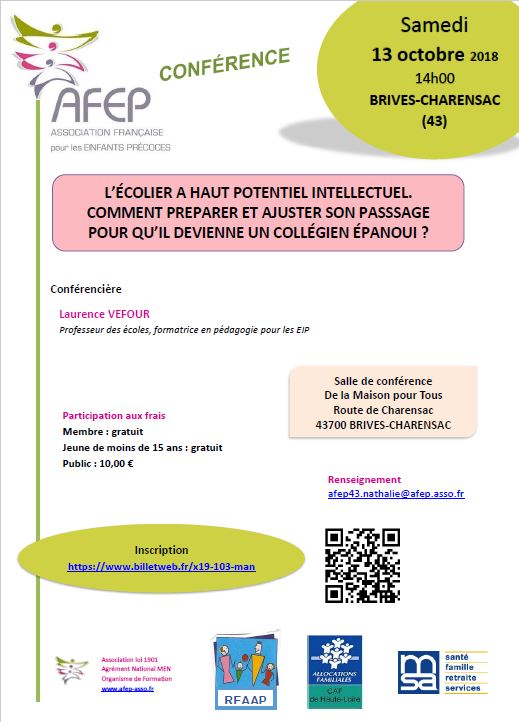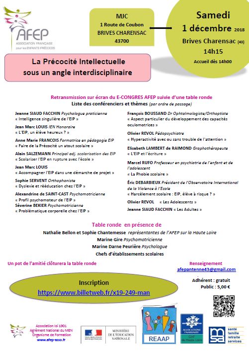 | Samedi 5 octobre 2019 CONFERENCE à MONISTROL/Loire "Décalage Haut Potentiel et sphère scolairee" Renseignements Inscriptions |