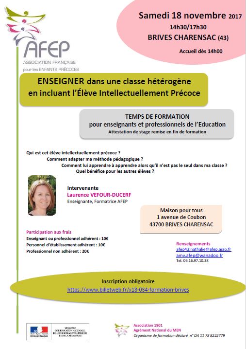TEMPS DE FORMATION pour les enseignants et professionnels "Enseigner dans une classe hétérogène en incluant l'élève intellectuellement précoce" Renseignements et Inscriptions |