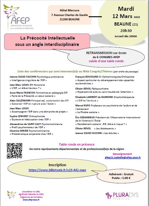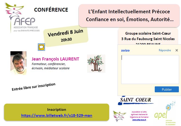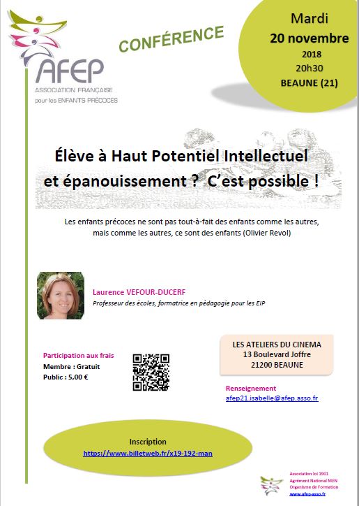 | CONFERENCE à BEAUNE Mardi 20 novembre 2018 "Elève à haut potentiel intellectuel et épanouissement? C'est possible!"" Renseignements et Inscriptions |