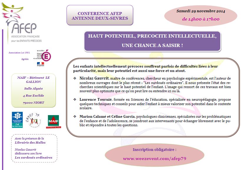 | | Vendredi 30 septembre 2016 à ANGOULEME 16 CONFERENCE "L'enfant intellectuellement précoce – Les enjeux de l'apprentissage" Renseignements et Inscriptions |